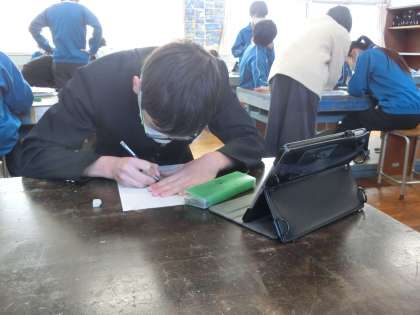 点描画での作品「万年カレンダー」の制作に取り組んでいます。今回は中間発表会ということで、仲間の作品を鑑賞し、作品づくりのコツを見つけ出していきます。どこまで作品を向上させることができるか。生徒たちの点描を打つ根気に期待したいと思います。