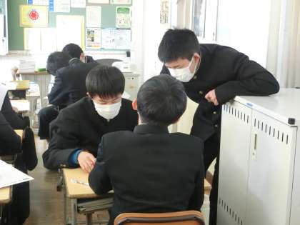 仲間同士のやり取りの中で、「あ〜、そういうことか!」「解説を見ればわかるんだけどなぁ…」などの声が聞こえてきます。公立高校の入試が控えている生徒は、確実に力をつけておいてほしいと思います。