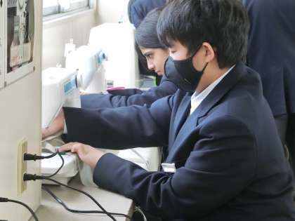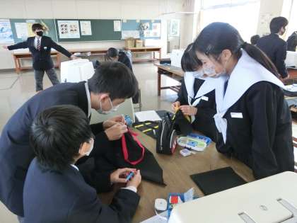 裁縫の学習で「エコバッグ」の製作に取り組んでいました。中学生になって初めての家庭科での実習。作業の手順を仲間としっかり確認しながら活動を進めています。ミシンの操作も誰もが手際よく進めています。仲間とお互いに見合うこと、近くの仲間に遠慮なくお願いできることで、活動がスムーズに行えているようです。