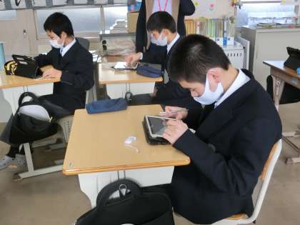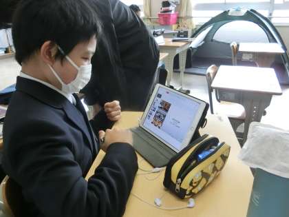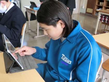 「 What do you have in your town?(あまたの町には何がありますか?)」をテーマに学習が進められていました。豊田市全体であったり、若林地区限定であったり、おすすめのスポットをタブレットで検索していきます。また、どんな特徴があるかも調べ、仲間に分かりやすく説明できるよう情報を集めていました。