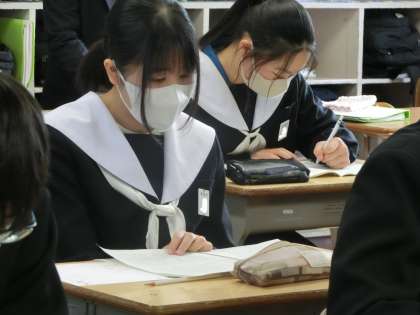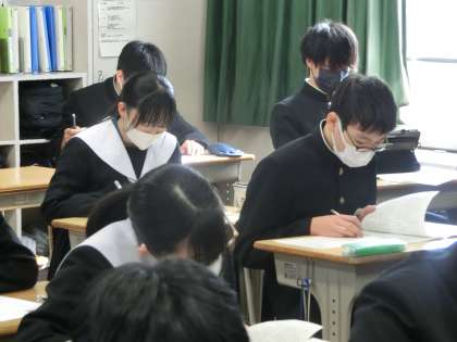 入試対策のプリントに取り組んでいました。私立高校・各種専修学校の一般入試を終えた生徒は中学校での学習の総復習として、今後、公立高校の入試を控えている生徒は実力をさらに伸ばすために取り組んでいます。目的は違っても、お互いを刺激し合う雰囲気に変わりはありません。