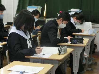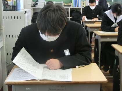 入試対策のプリントに取り組んでいました。私立高校・各種専修学校の一般入試を終えた生徒は中学校での学習の総復習として、今後、公立高校の入試を控えている生徒は実力をさらに伸ばすために取り組んでいます。目的は違っても、お互いを刺激し合う雰囲気に変わりはありません。