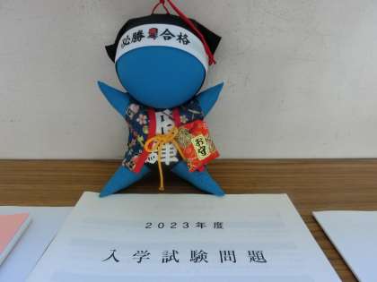 3年生の学年フロアに設置してある進路コーナー。学年部の先生たちが入試の過去問が置いたり、現地に出向いて手に入れたお守りなどを飾っています。