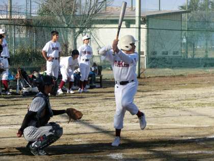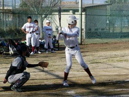写真は、野球部の練習試合の様子です。保見中学校にお越しいただきました。寒い中でお練習試合でしたが、どちらのチームもよく声が出ており、活気のあるゲームでした。この練習試合を通して、様々な課題を見つけることもできました。