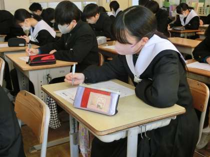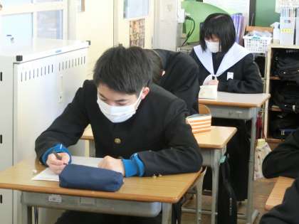 入試対策に取り組んでいました。まずは個人でしっかり取り組んだあと、解答・解説が配付されるタイミングで仲間同士での確認が始まります。私立高校一般入試の合格を手にした生徒が多い中、公立高校の入試に向けての勉強にもさらに熱が入っているようです。