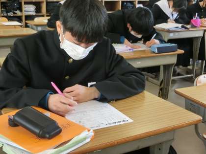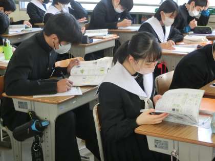 学習診断テスト対策として「生物分野の復習をしよう」をテーマにプリントでの学習に取り組んでいました。学習したことがしっかりと定着しているかを確認するとともに、弱点を少しでも克服できるよう、タブレットやノートで確認しながら、プリントを進めている生徒もいました。テスト当日、今の努力が実ってほしいと思います。
