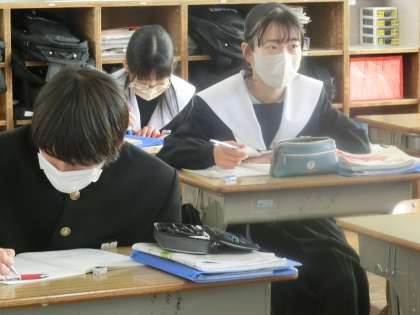 1/29 2-2 テクニックの伝授 2 公開日 2024/01/29 更新日 2024/01/29 各学年から 2年2組の数学の授業の様子です。 先日取り組んだ学習診断テストの過去問の解説が行われていました。同時に正確に早く正解を導き出すテクニックも伝授されていました。直前まで努力を惜しまず、本番に臨んでほしいと思います。