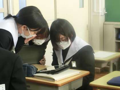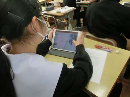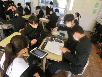 「SDGsのゴールは、どのような課題と関連しているのか?」をテーマに各自でまとめてきたプレゼンレポートをグループ内で発表していました。自分の考えを仲間に伝えながら、意見やアドバイスをもらっています。この時期になっても高いモチベーションで学習に向かう3年生。本校の誇りです。