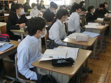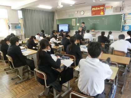 空間図形について学んでいました。2日後に控えた学習診断テストの出題範囲もこれで完了。授業の後半は、本番当日までにしっかり力をつけおくためにプリントでの学習です。直前の確認として、基本的な問題を中心に取り組んでいました。