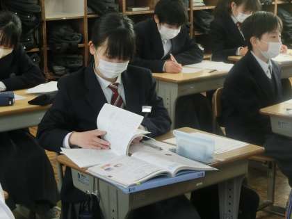 空間図形について学んでいました。2日後に控えた学習診断テストの出題範囲もこれで完了。授業の後半は、本番当日までにしっかり力をつけおくためにプリントでの学習です。直前の確認として、基本的な問題を中心に取り組んでいました。