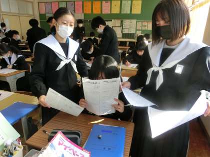 入試対策としてプリントでの学習に取り組んでいました。弱点を少しでも減らすため、仲間同士でのアドバイスを与え合っています。解き方を教えてもらうだけでなく、どんなひらめきで早く正確に正解を導き出すテクニックも学んでいるようです。