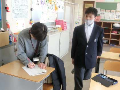 各自の課題に取り組んでいました。問題のぎっしり詰まったプリントの束やモニターを使って立体図形の学習です。これまで取り組んできたプリントが終了した生徒に新しいものが配られ、こんなやり取りがありました。