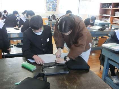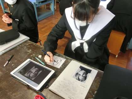 点描画での作品「万年カレンダー」の制作に取り組んでいます。黙々とひたすら点を打っていき、次第にイメージどおりの人物が浮かび上がってきています。途中であきらめず、納得のいく作品づくりに取り組んでほしいと思います。