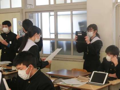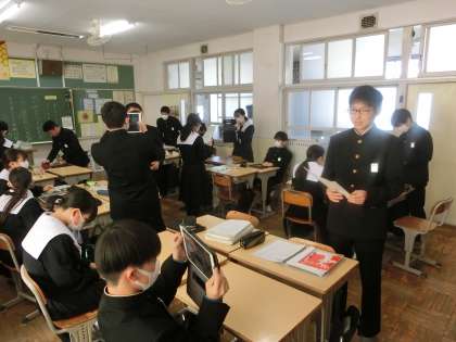 1/30 3-3 緊張に負けず… 5 公開日 2024/01/30 更新日 2024/01/30 各学年から 3年3組の国語の授業の様子です。 「説得力のある構成で伝えよう」の単元もいよいよ終盤に入りました。今回はこれまでまとめてきたレポートをグループ内で発表していました。内容だけでなく、発表も仕方についても仲間に評価してもらいます。タブレットを向けられると緊張度がアップしますが、頑張って発表していました。