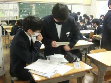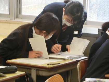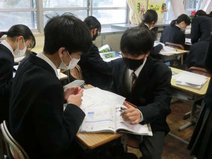 明日に控えた学習診断テストに向け、直前の追い込みです。教科担任や仲間に不安な部分を積極的に質問しています。今日の夜の家での学習に役立ててほしいと思います。