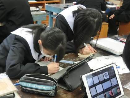 「木彫マスターになろう」をテーマに彫刻刀での基本的な彫り方の練習を経て、いよいよデザインを決めての作品(=コースター)づくりに入っていきます。デザイン必死に考えている生徒、さっそく木を削る作業に入っている生徒など様々です。