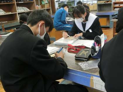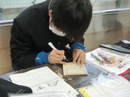 「木彫マスターになろう」をテーマに彫刻刀での基本的な彫り方の練習を経て、いよいよデザインを決めての作品(=コースター)づくりに入っていきます。デザイン必死に考えている生徒、さっそく木を削る作業に入っている生徒など様々です。