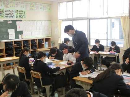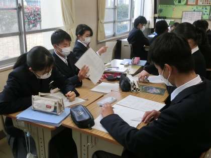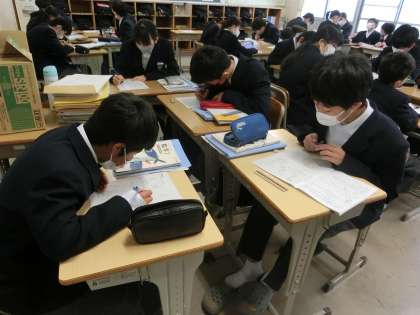 空間図形について学んでいました。平面にかかれた図形をいかに立体的にイメージできるかがポイントとなります。今後、「平行な〜」や「垂直な〜」などの問題に取り組んでいきます。