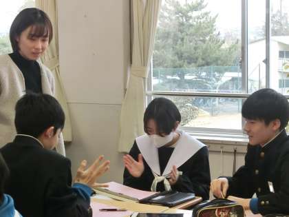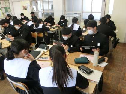 「SDGsのゴールは、どのような課題と関連しているのか?」をテーマに仲間からアドバイスをもらって完成したプレゼン資料を使って、グループ内で発表が行われていました。仲間の発表に感心している生徒が多くいました。