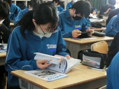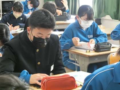 2週間後に控えた義務教育最後のテストとなる「確認テスト」に向けて学習に励んでました。テキストには複数回取り組んだ跡があります。また、学習用タブレットにのアプリでこれまで間違えていた問題を重点的に取り組んでいる生徒もいました。勉強の方法が確立できていることに感心しました。