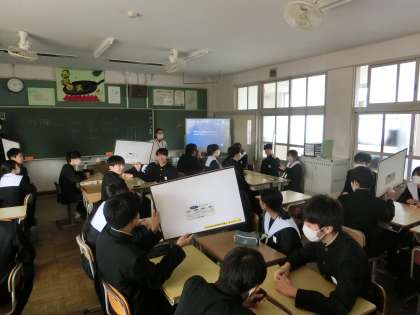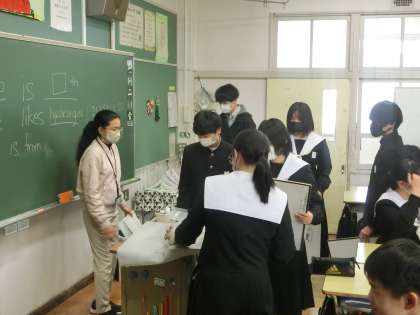 ALTとのコミュニケーション活動の学習です。ALTに関する様々な質問に第一印象や予備知識だけで答えていくゲームに、グループ対抗で挑戦していました。その後、リーディングの練習でも発音やテンポのよい活動が行われていました。