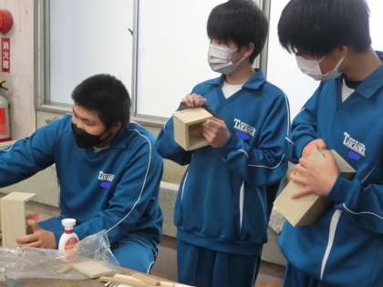 木製品づくりもいよいよ完成目前となってきました。ヤスリを丁寧にかけ、仕上がりをさらによくしていこうと努力しています。完成するその時までいっさい手を抜かず、仲間の力も借りながら、最高の作品づくりに没頭していました。