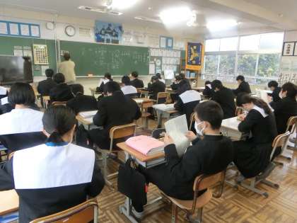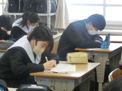先週行われた学習診断テストの解説が行われていました。単なる問題の解説だけでなく、正答率を上げる方法や問題を解く順番などにも触れていました。このテストを通して、勉強は授業だけでなく、日頃から読書や新聞を読むことも重要であることを感じていたようです。