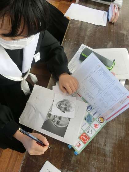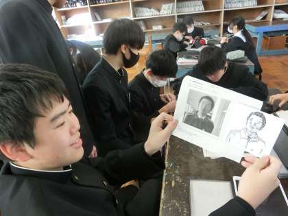 点描画での作品「万年カレンダー」の制作に取り組んでいます。黙々とひたすら点を打っていき、次第にイメージどおりの人物が浮かび上がってきています。素材には、歴史上の有名人や最近人気の人物がほとんどですが、中には学年部の先生で作品づくりをしていて、学年愛を感じました。