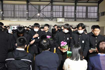 2/9 3年 心温まる贈り物 8 公開日 2024/02/09 更新日 2024/02/09 特別活動 昨日の午後、3年生の企画で「謝恩会」が実施されました。 「お世話になった先生たちに、何とか感謝の気持ちを伝えたい」という思いから実現したこの会。感謝の気持ちや想いを呼びかけや歌声に乗せて届けてくれました。また、一人一人に鉢花とメッセージ集が手渡され、笑顔の多いとても温かな会になりました。