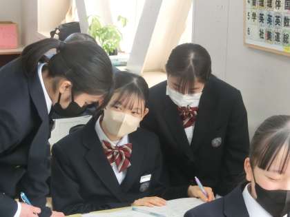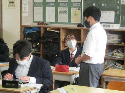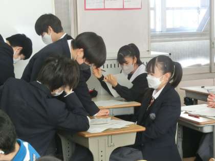 定期テストの返却・解説が行われていました。しっかり解説を聞き、理解の不十分だった問題をしっかり解き直しています。仲間や先生に学習の仕方についてもアドバイスをもらっていました。