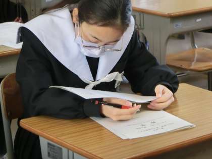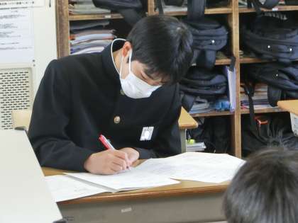 定期テストの返却に合わせて、正答率の低かった問題を中心に解説が行われていました。単に正解を確認するのではなく、途中の考え方はどうだったのかを思い出しながら、解き直しに取り組んでいました。