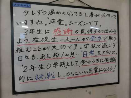 2/13 1年 学年教師からのメッセージ 公開日 2024/02/13 更新日 2024/02/13 各学年から 今週のホワイトボードメッセージです。 卒業シーズンの生活で意識すべきことが記されています。 3年生に感謝の気持ちが伝わるよう 在校生一人一人が全力で取り組むことが大切です。 「2年生の0学期」として、 今のうちに意識的に挑戦し、 かっこいい先輩になろう!
