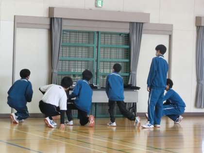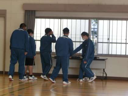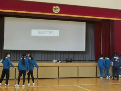 グループに分かれ、オリジナルのダンスづくりです。曲のイメージに合うよう学習したステップやポーズを取り入れていきます。集団でのパフォーマンスの上達を期待したいと思います。