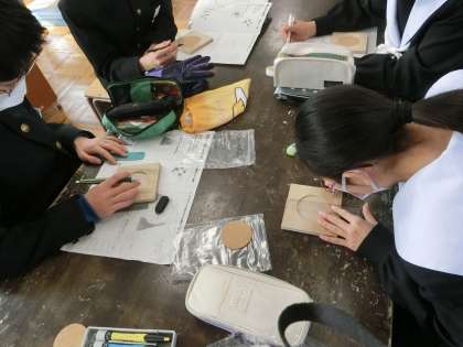 木彫の学習でコースターづくりに取り組んでいました。アイデアの詰まったデザインにそって、慎重に彫りを進めていきます。