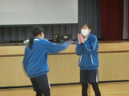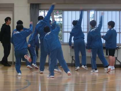 昨日に引き続きグループに分かれ、オリジナルのダンスづくりに取り組んでいました。昨日はなかなか動き出せなかった生徒たちでしたが、今日はノリノリ。この調子でパフォーマンスの上達をめざしてほしいと思います。