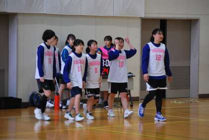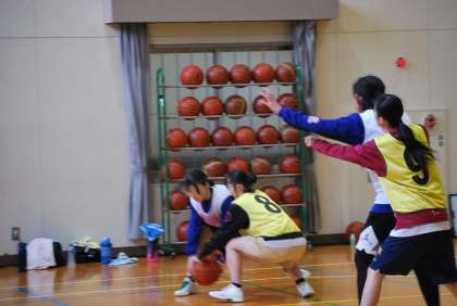 写真は、バスケットボール部の活動の様子です。梅坪台中学校との練習試合、浄水中学校との合同練習・クリニックが行われました。