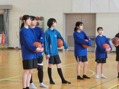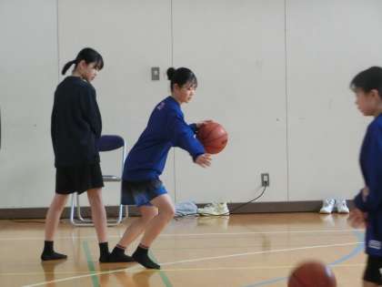 写真は、バスケットボール部の活動の様子です。梅坪台中学校との練習試合、浄水中学校との合同練習・クリニックが行われました。