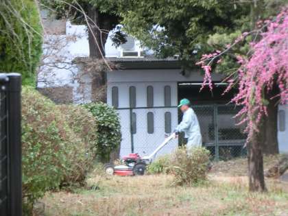 時折小雨が降る中、校内整備員さんが草刈りをしてくださっていました。雨に濡れた草は刈りにくく、いつもより作業が大変になります。でも、「最後まできれいな学校で…」と卒業式に合わせて計画的に作業が進められています。