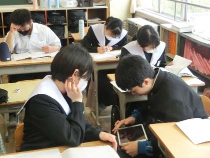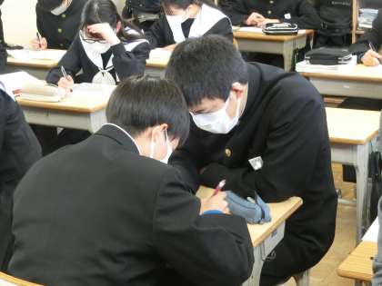 入試対策に取り組んでいました。私立高校や公立高校の推薦入試を終えた生徒が、一般入試の生徒たちに全面協力です。とてもよい雰囲気で勉強に励んでいます。