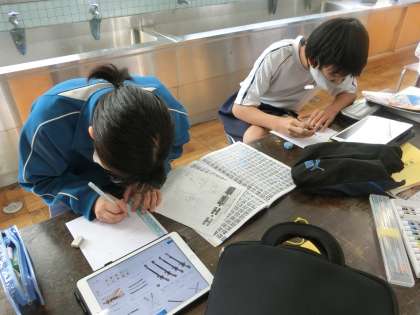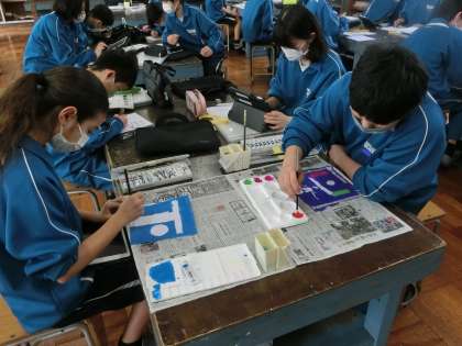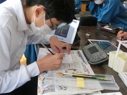 「シンボルネーム」の作品づくりです。名前の一文字を使い、自身を象徴する作品に仕上げていきます。デザインが確定し、いよいよ色付けが始まりました。タブレットで作成したイメージ画にどれだけ近づけるか。色の調整も慎重に行っていました。