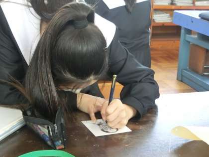点描画での作品「万年カレンダー」の制作もいよいよ大詰めです。パネルに努力の結晶のイラストを差し込むと完成となります。カレンダー部分にも細工がしてあるため、半永久的にカレンダーとして使えます。中学校での思い出とともに、末永く使ってほしいと思います。