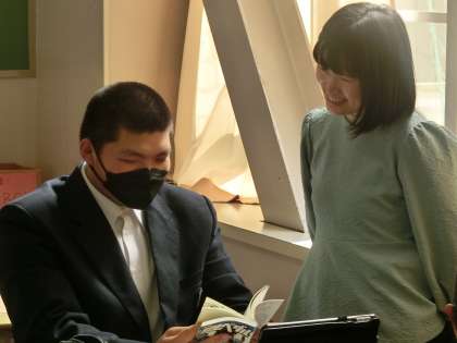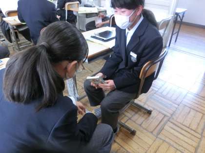 ビブリオトークの発表準備に取り組んでいました。原稿を考えたり、仲間にパフォーマンスの様子を見てもらったりしています。また、仲間からアドバイスをもらい、さらに説得力のある内容にしようと努力している生徒もいました。