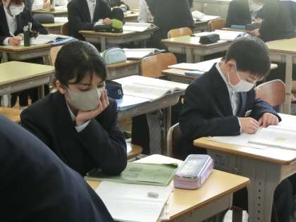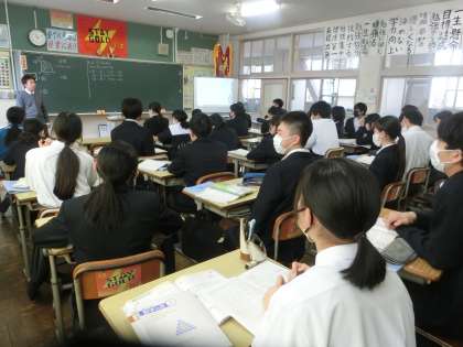 一年間のまとめとして図形の演習問題に取り組んでいました。学習した内容を思い出したり、最短で正解を導き出す方法を考えたりしていました。
