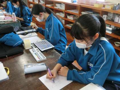 「シンボルネーム」の作品づくりです。名前の一文字を使い、自身を象徴する作品に仕上げていきます。デザインが確定し、いよいよ色付けが始まりました。タブレットで作成したイメージ画にどれだけ近づけるか。色の調整も慎重に行っていました。