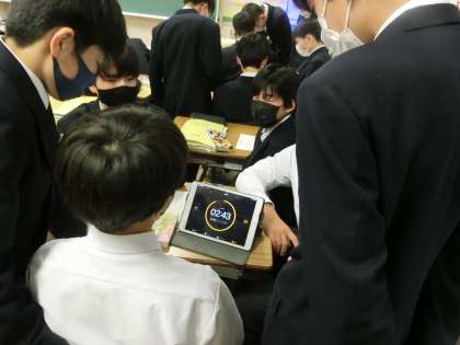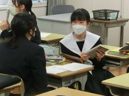 ビブリオトークに向けての準備に取り組んでいました。発表原稿をもとに、パフォーマンスや時間配分、内容などについて、発表練習を通して仲間からアドバイスをもらっていきます。本番でレベルアップした発表・パフォーマンスに期待したいと思います。