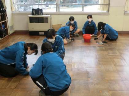 全体をほうきで掃き、分担して床を磨いていきます。床の色のトーンが明るくなるにつれ、充実感も増してきているようです。