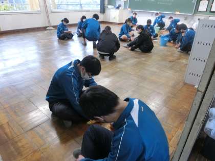 教室のワックスがけを行うため、3年生は朝の会が終わるとすぐに作業に取り掛かっていました。
