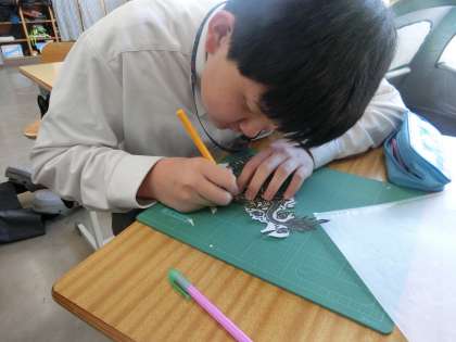 今年の干支「竜」を題材とした切り絵と点描技法を活用したドットアートの作品づくりに取り組んでいました。どちらも自身が気に入ったデザインで活動を進めているため、集中力の凄さを感じました。