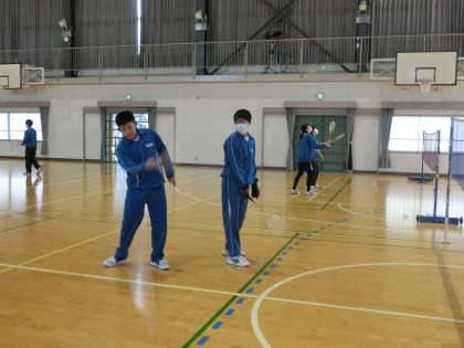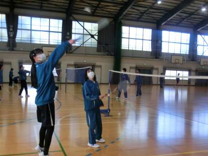 バドミントンのゲームが行われていました。総当たりで対戦できるようきるよう、時間を区切って活動しています。相手の能力に合わせた対戦は、見ていて楽しめるとともに、同じクラスの仲間を思いやる優しい気持ちも伝わってきました。