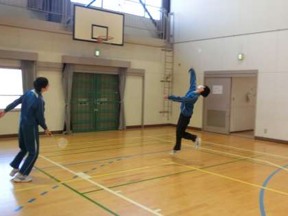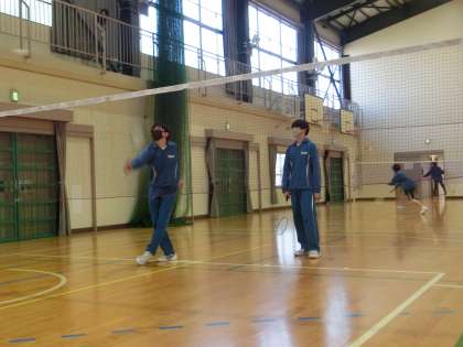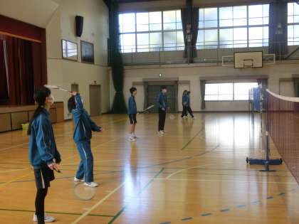 バドミントンのゲームが行われていました。総当たりで対戦できるようきるよう、時間を区切って活動しています。相手の能力に合わせた対戦は、見ていて楽しめるとともに、同じクラスの仲間を思いやる優しい気持ちも伝わってきました。